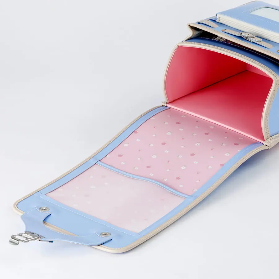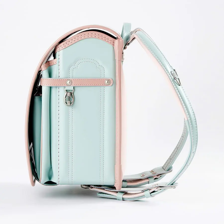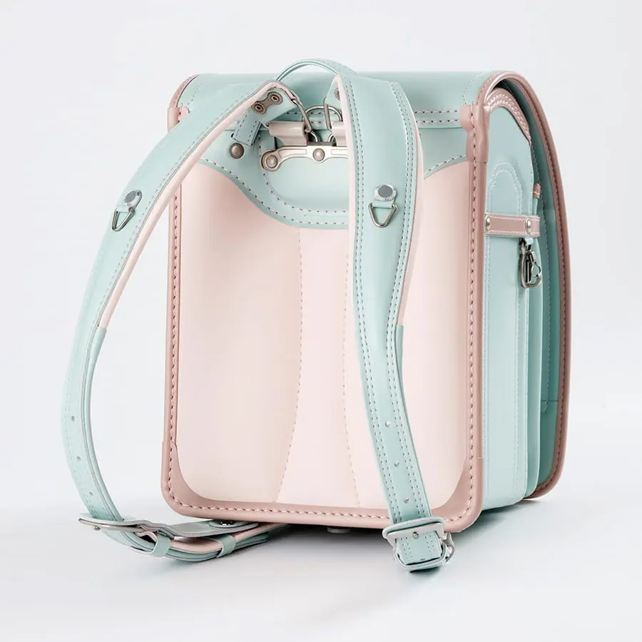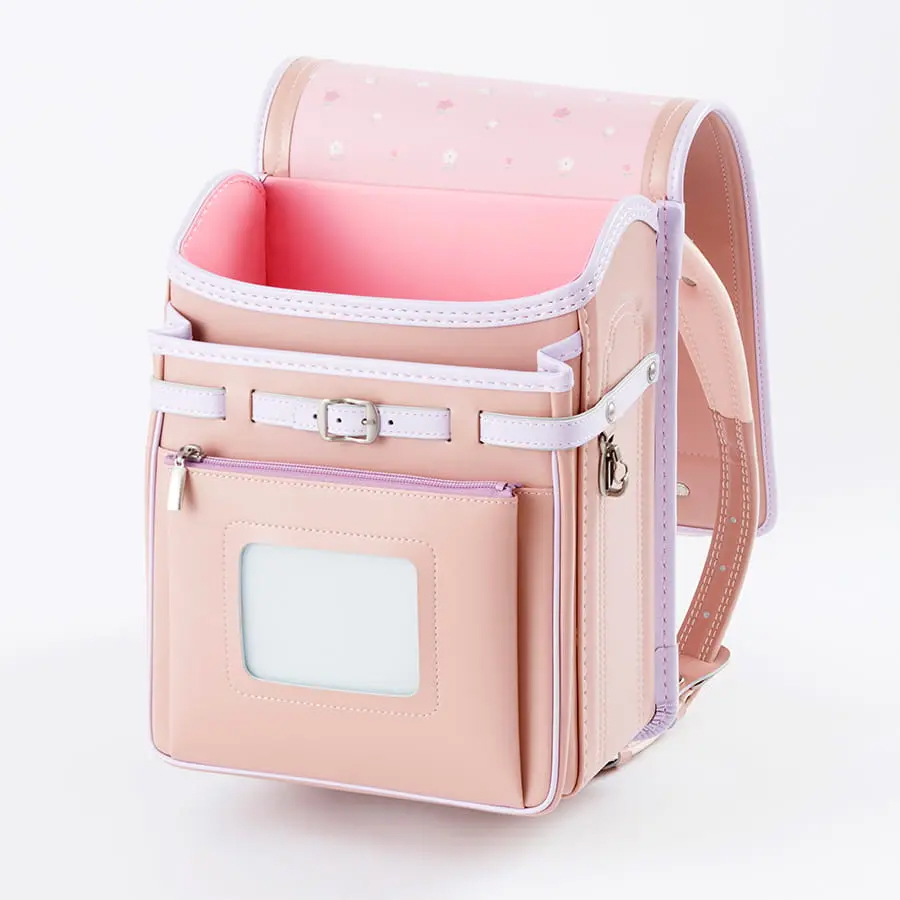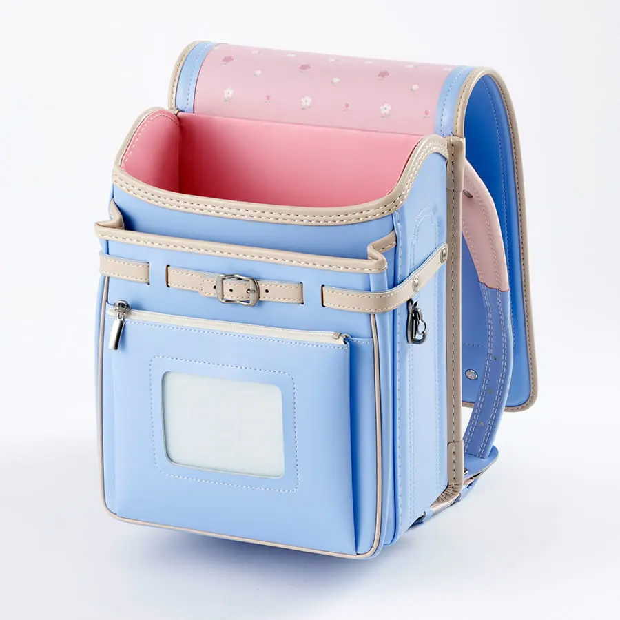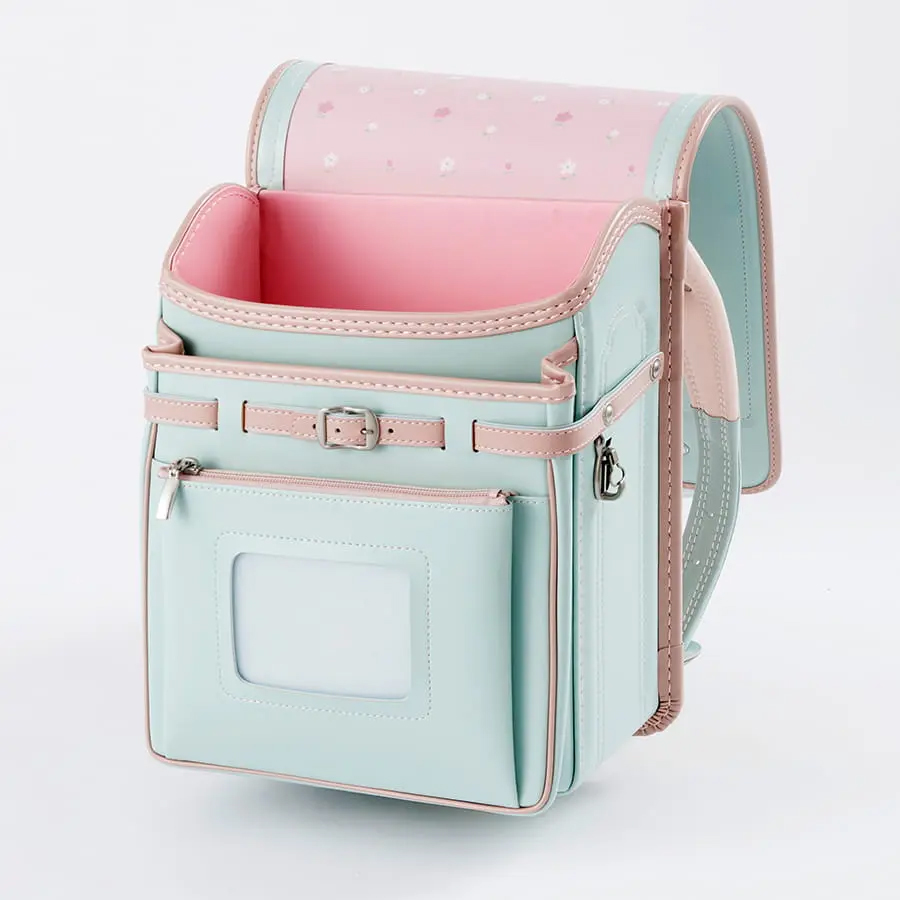 「毎日に、ほんのり甘い彩りを。くすみバイカラーが、女の子の笑顔を優しく包む。」淡いピンクの花柄かぶせ裏で、心までキュン。66,000円で叶う、ときめく自分だけランドセル。