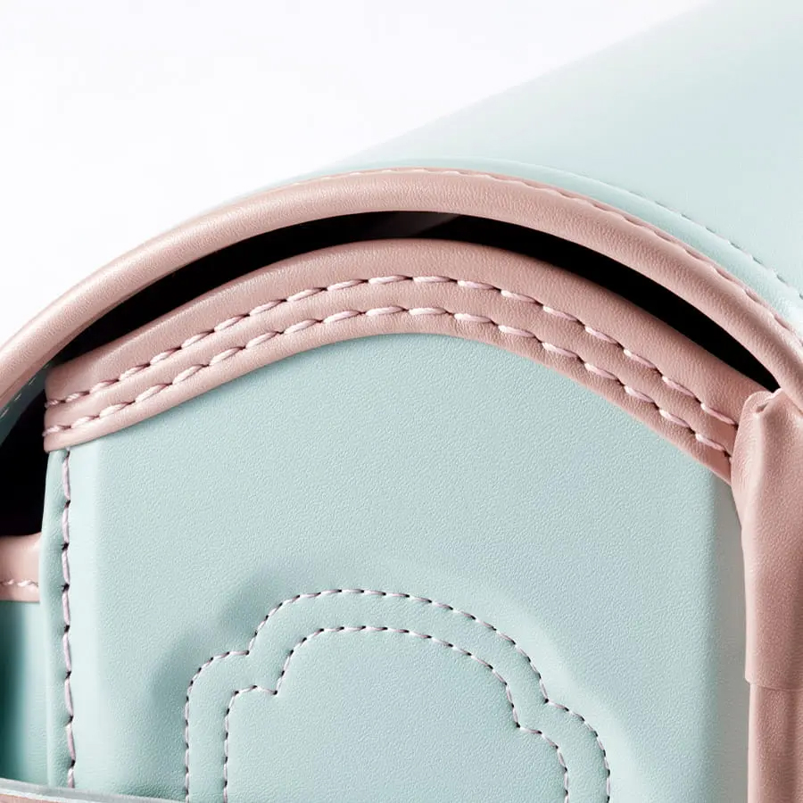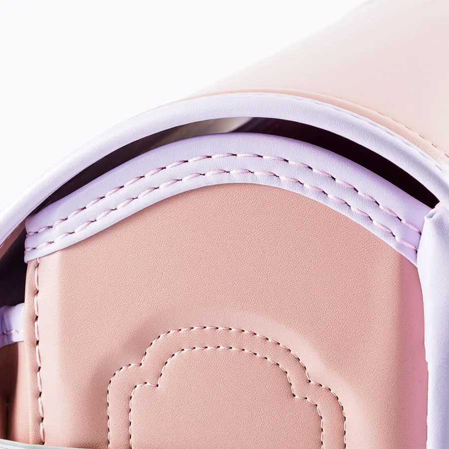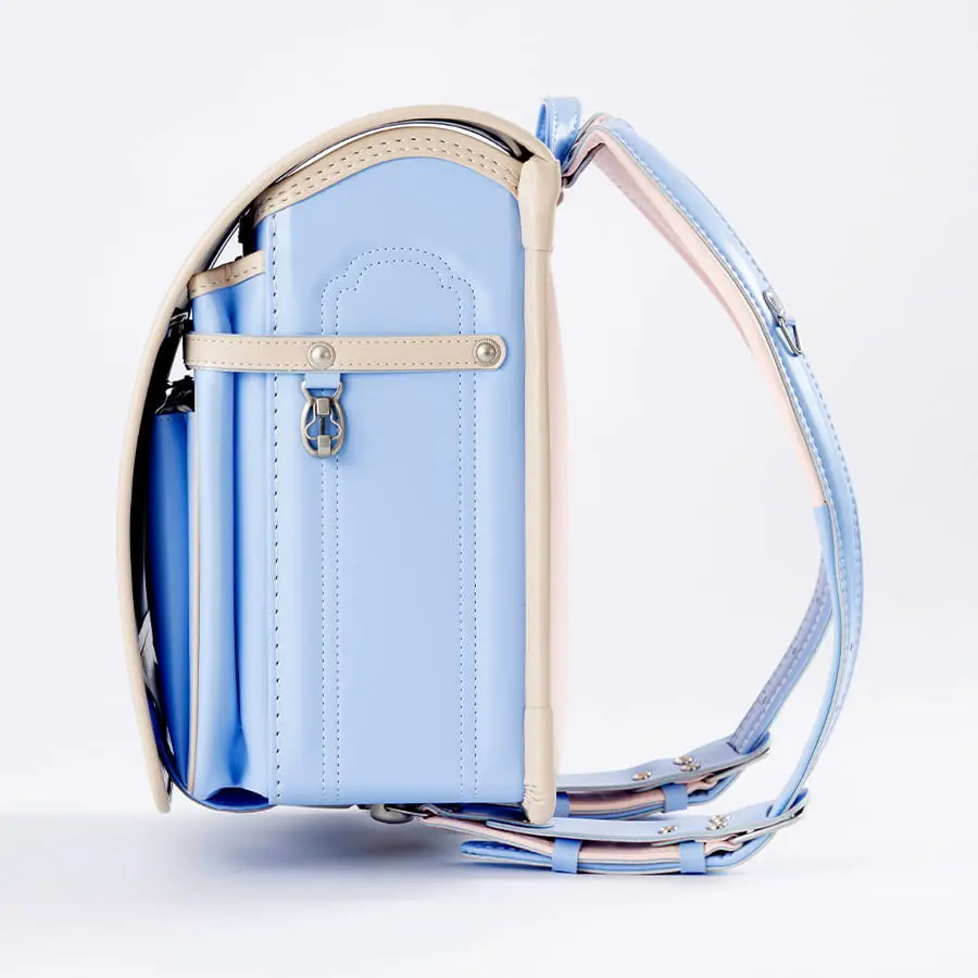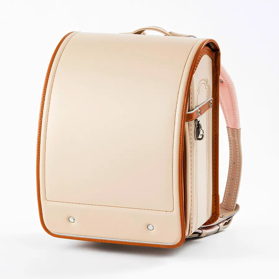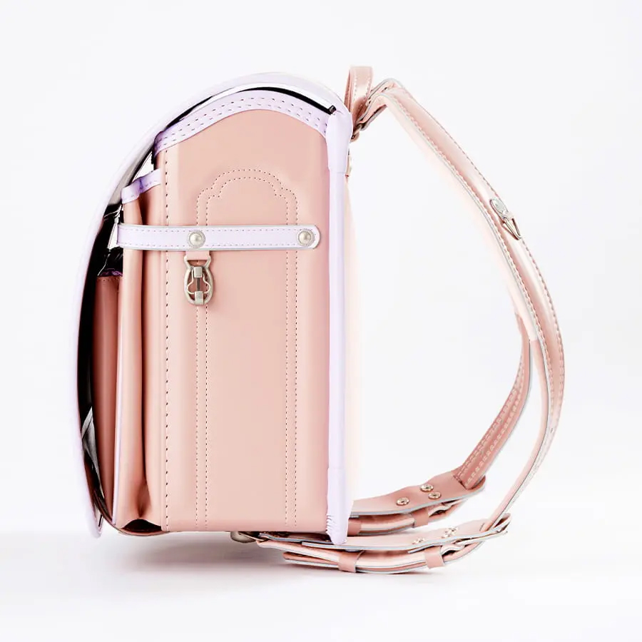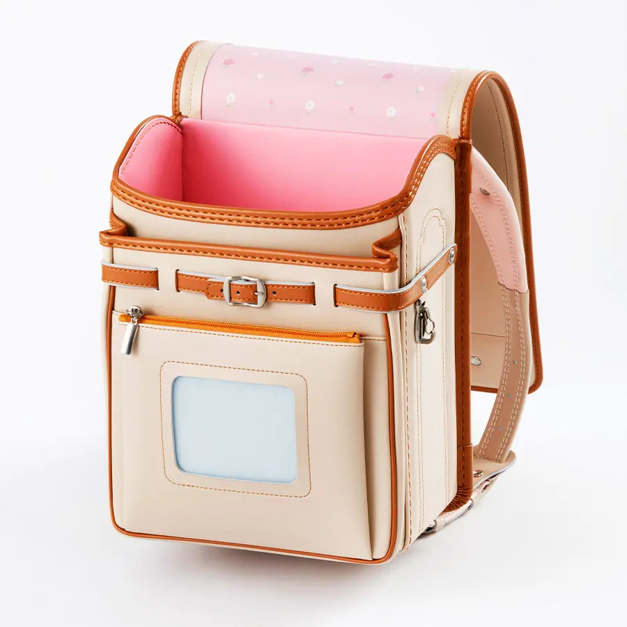 「毎日に、ほんのり甘い彩りを。くすみバイカラーが、女の子の笑顔を優しく包む。」淡いピンクの花柄かぶせ裏で、心までキュン。66,000円で叶う、ときめく自分だけランドセル。