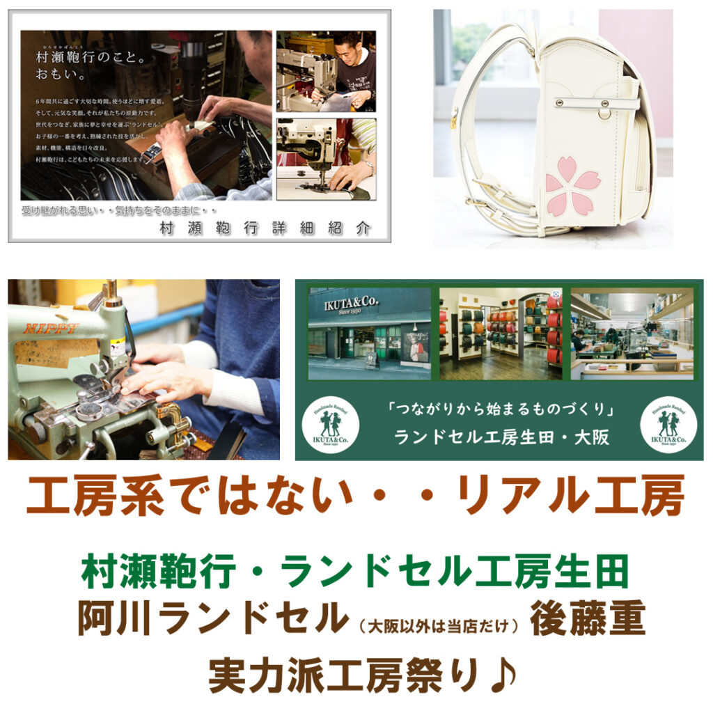 阿川ランドセル:大阪でコツコツと積み上げた製作専門工房。有名ブランドモデルや大手百貨店の最上位モデルを裏方として制作してる陰に隠れた実力派工房。全国で常設展示販売してるのは同工房とランドセル専門店おりじなるぼっくすのみ。来期も大手ブランドからの製作依頼が殺到しており今期と同様に常設は当店だけ。長年交渉し今期から展示販売しましたが実物を見て購入されていく方が多くデザイン工房としては国内最上位と言えるクオリティの陰に隠れた実力派工房です。