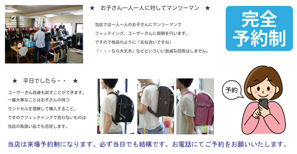 当店ではお一人お一人のお子さんに負担の少ないランドセルを推奨しているランドセル専門店。しかもフィッテング推奨歴20年以上の他社とは圧倒的な経験値の差があるお店。是非、お子さんに健康に成長してもらうためのランドセル選びを体験していただきたいと思いますのでご予約の上、ご来場いただけますようお願いいたします。