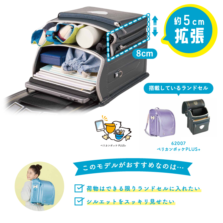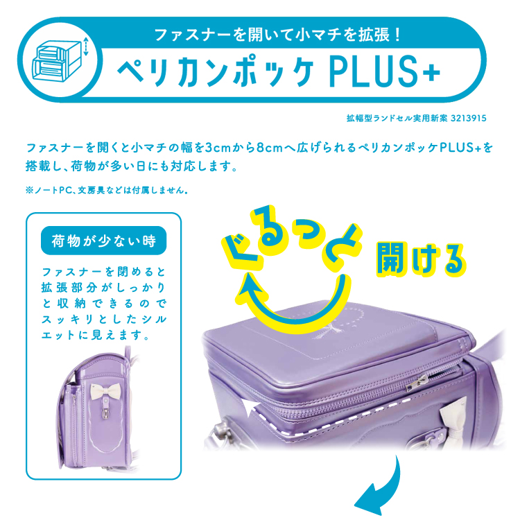 拡張型前マチポケット(ペリカンポッケ)搭載で大人気の大容量モデルペリカンポッケplus+がリニューアルして新登場。女児は人気カラーをそのままに再度に可愛らしいリボンモチーフ。男児はクールカラーでレトロ感を出したデザイン&カラーに返信。夏休み前や冬休み前の荷物の多いときに拡張できるペリカンポッケはまるでママの手のようにお子さんをサポート。負担軽減機能充実の現代のランドセルならではの拡張機能で6年間両手を空けて安心通学を目指したランドセル♪